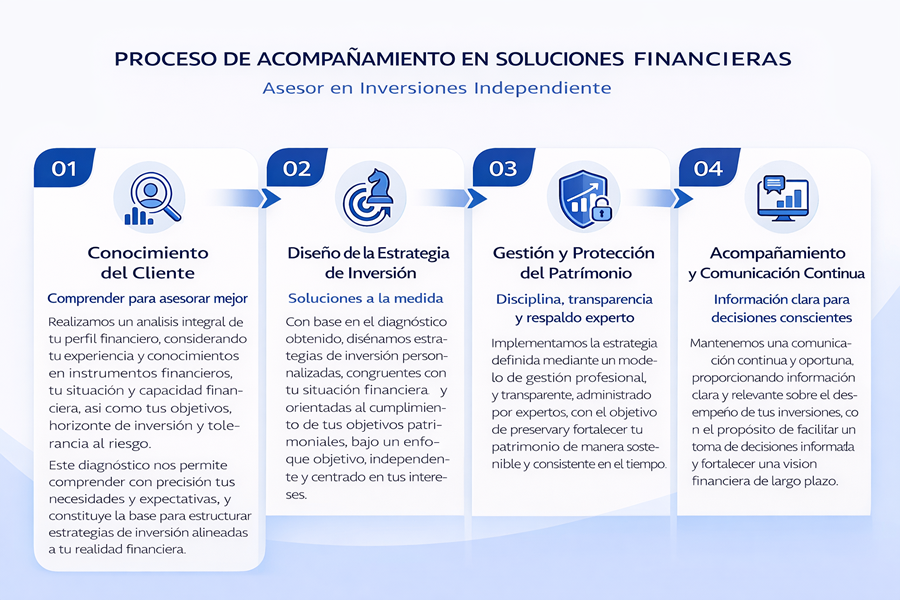 Entendemos que las necesidades financieras evolucionan con el tiempo. Por ello, nuestro enfoque se basa en un análisis profundo de tu situación actual y de tus objetivos a largo plazo. A través de soluciones estructuradas y una planificación financiera sólida, trabajamos para brindarte certeza, respaldo y acompañamiento en la toma de decisiones, orientándote siempre hacia la alternativa que mejor responda a tus intereses.